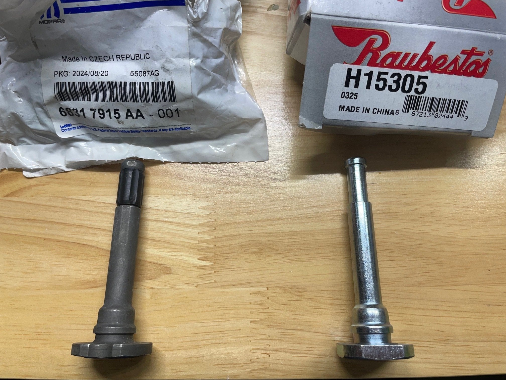 I ordered some Raybestos front brake slider pins (part #H15305). When I compare them to the OEM pins they appear to be different. Attached is a photo, the OEM pin on the left and the Raybestos pin on the right. The OEM pin has a little piece of rubber out near the end of the pin whereas the Raybestos one does not. The diameter of the two pins at this point is obviously different as one has rubber and one does not.