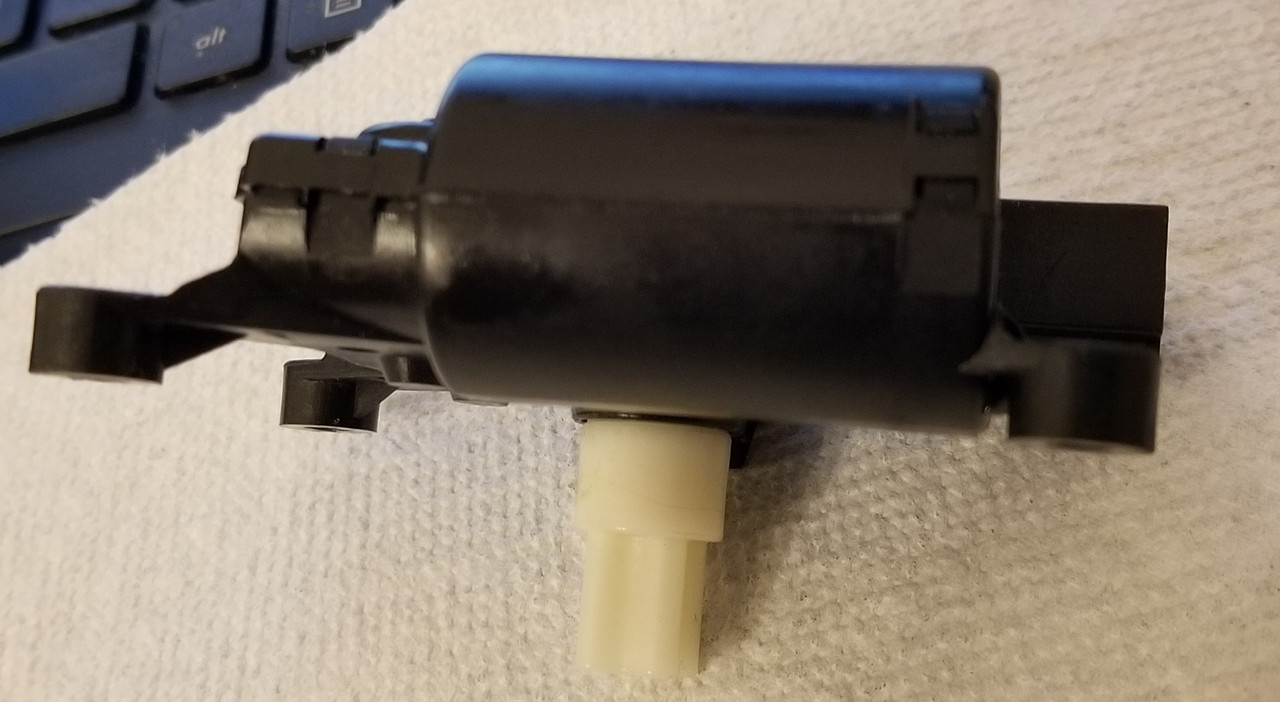 The servo motor that drives the recirculation (blend) door is on the left side of the cabin air filter housing. It is stocked by my dealer and should be a stocked item for most Chrysler dealers as it is used in multiple model cars and apparently fails often. The two screws that m0ebius604 mentioned are difficult but not impossible to get to. Looking up at the failed servo while laying on my back on the floor, its exterior appeared a little oily from leakage. After all, tens of thousands of extra cycles were run on this motor due to its failed position feedback. The motor in the servo runs forward and backward depending on the polarity of the 12V applied to its pins 5 and 6. Position sense is likely obtained from a 4.3 Kohm potentiometer (pins 1,2 and 3). Resistance between pins 1 and 3 is a consistent 4.3 Kohm no matter what the servo position, so pin 2 is likely to be the Pot wiper. My new servo has the same resistance between pins 1 and 3 as the failed servo. Resistance between pin 2 and either pin 1 or 3 on my failed servo is inconsistent with position and higher than expected which is a dead giveaway for a dirty, worn out, or oil contaminated Pot wiper contact. (So much for “Swiss Made” servo quality).